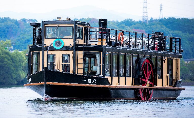 レトロかわいい雰囲気が⼈気の外輪汽船。歴史と⽂化あふれる⽯⼭・瀬⽥川の⾵景に溶け込み遊覧します。