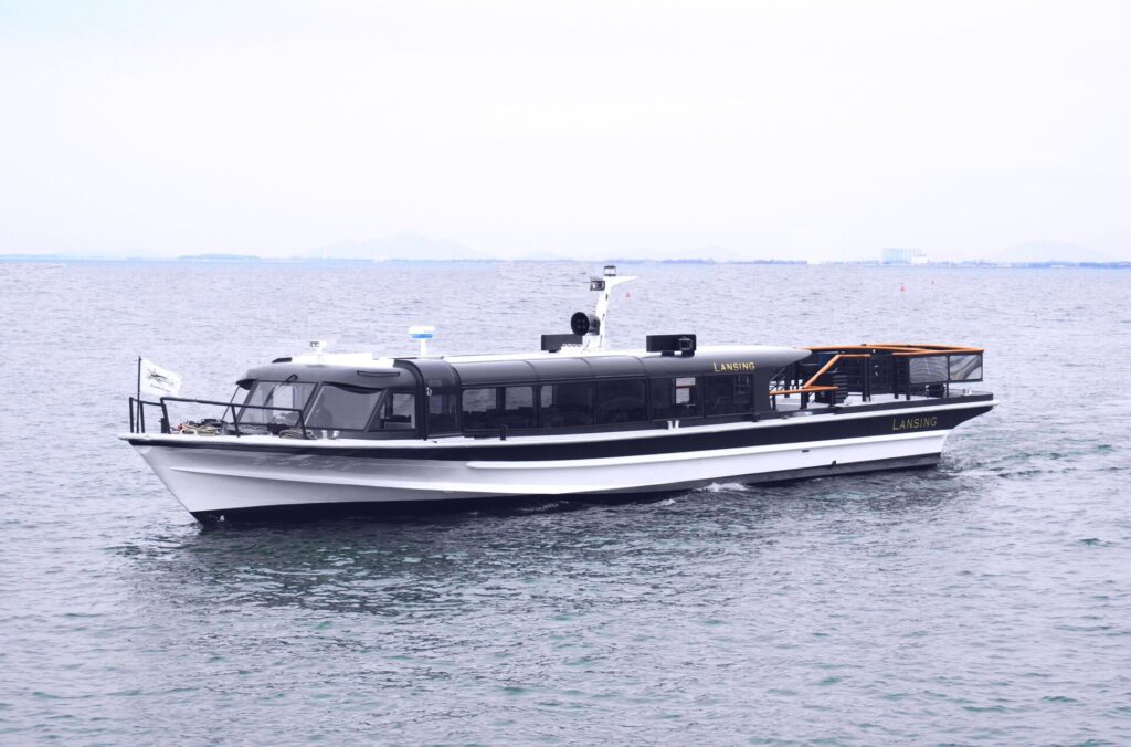スタイリッシュな⾼速船。当時の⾈旅の出発地「打出浜」にも近い⼤津港・におの浜観光港に寄港する便もあります。