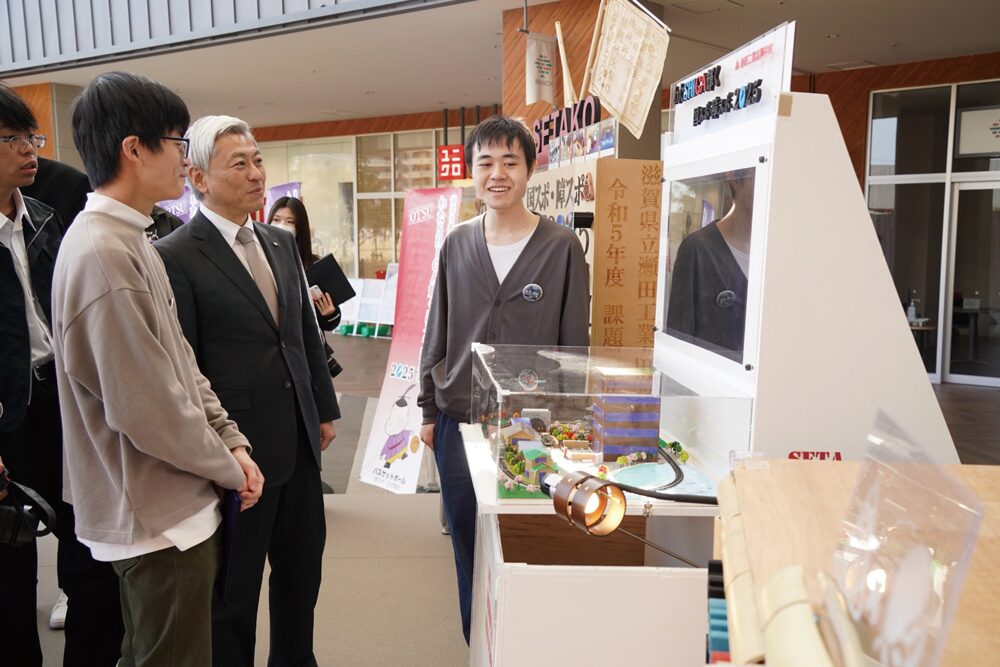 令和7年に開催される両大会の機運醸成を図るため、手作りのカウントダウンボードが市内に設置されました。製作にあたったのは瀬田工業高等学校の生徒の皆さん。約1年の製作期間をかけた3台は、3Dプリンターで加工した部品で飾り付けられたものや、子どもにも興味を持ってもらおうと鉄道模型のジオラマを組み合わせたもの、SDGsを意識して竹を意匠に取り入れたものなど高校生の技術とアイデアが盛り込まれた力作ぞろいです。